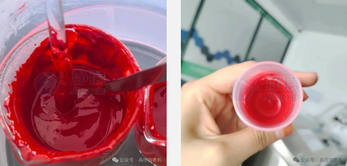啟動設備,物料在高壓下被均質,流出后即可觀察到質地變得絲滑、色澤均勻亮麗。