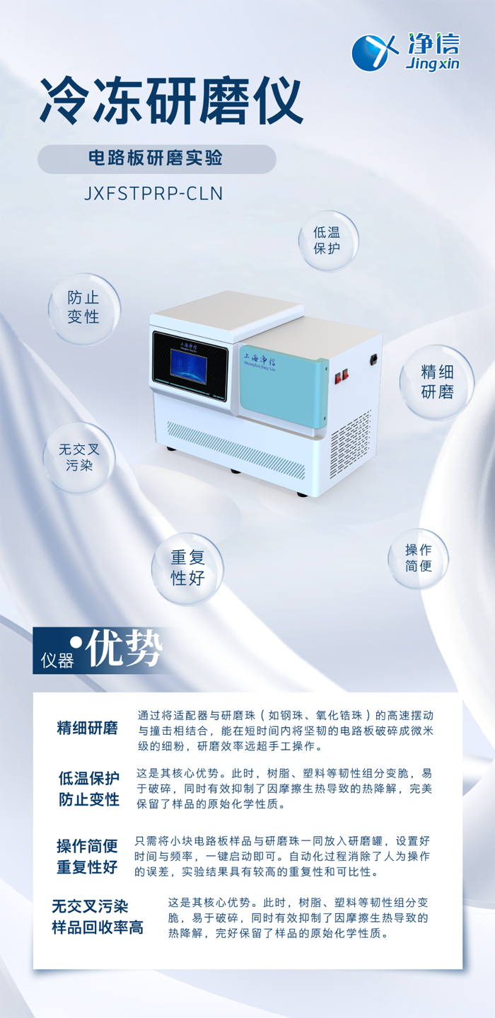 凈信冷凍研磨儀憑借其低溫、避免污染的研磨特性,成功解決了電路板這類復(fù)雜復(fù)合材料的前處理難題。它不僅是提升RoHS檢測、材料成分分析等數(shù)據(jù)準(zhǔn)確性的“得力助手”,也是在電子廢棄物資源回收領(lǐng)域進(jìn)行物料分析的“神兵利器”。選擇凈信冷凍研磨儀,意味著選擇了一條通往更可靠實(shí)驗(yàn)結(jié)果的捷徑,為您的科研與質(zhì)控工作提供了強(qiáng)有力的技術(shù)保障。