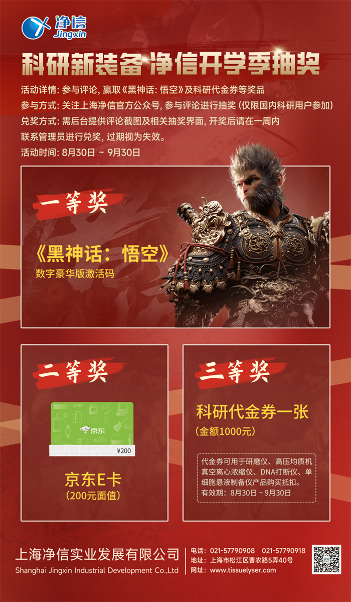 親愛的科研伙伴們,新學期伊始,是不是感覺你的實驗室還缺點什么?上海凈信來幫你補齊裝備!參與我們的開學季抽獎活動,就有機會獲得《黑神話:悟空》數字豪華版激活碼,讓你的科研生活不再單調。不僅如此,還有京東E卡和科研代金券等你來拿,讓你的科研之路更加順暢!